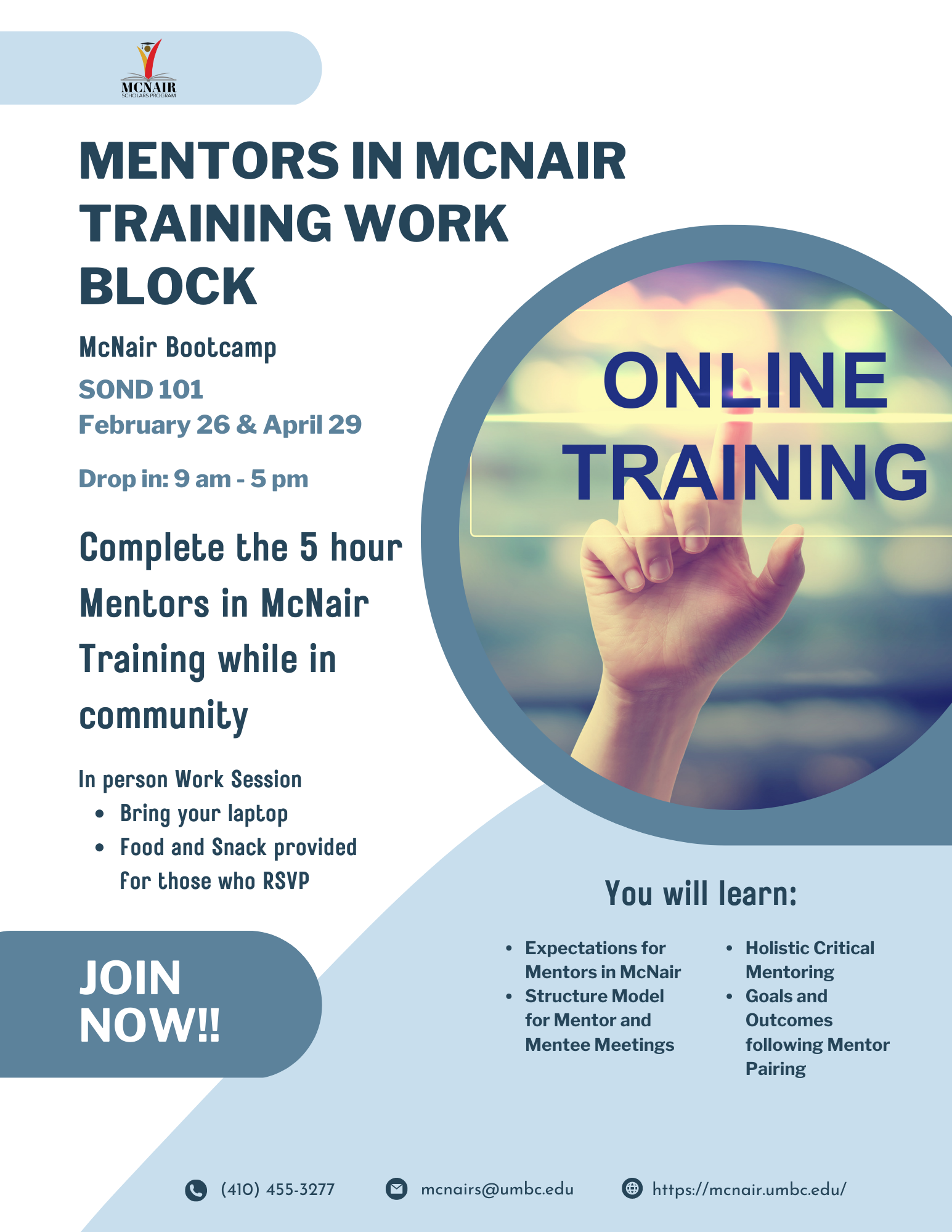 Join the in-person Mentors in McNair Training Work Block and complete the 5- 6 hour training while in community! We are providing an optional workspace to utilize during our pre-scheduled boot camp, and you can drop by anytime between 9 and 5. Bring your laptop, and lunch will be available for those who RSVP.