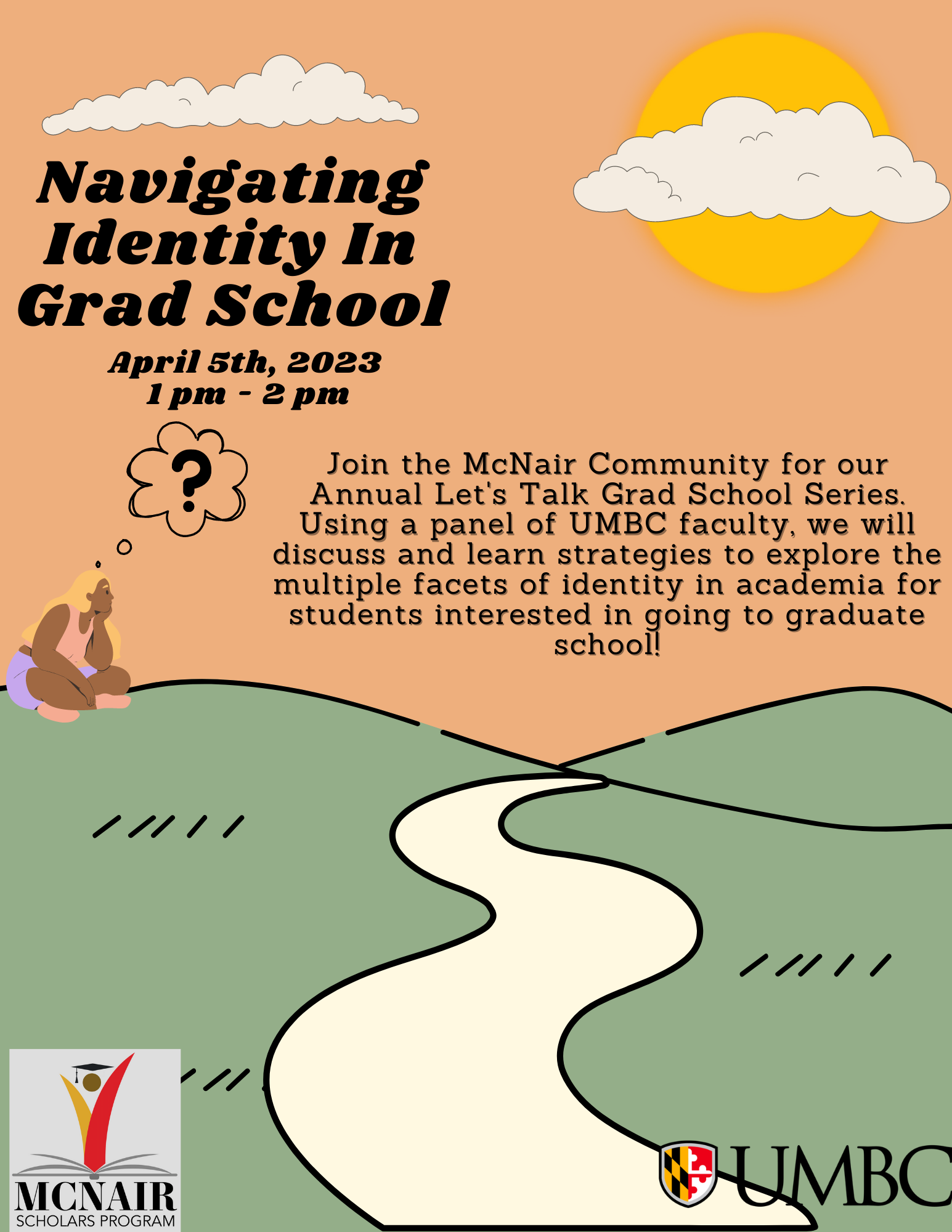 Join the McNair Community for our Annual Let's Talk Grad School Series. Using a panel of UMBC faculty, we will discuss and learn strategies to navigate identity in doctoral programs. We will cover tips on navigating the multiple facets of identity in a post baccalaureate world.