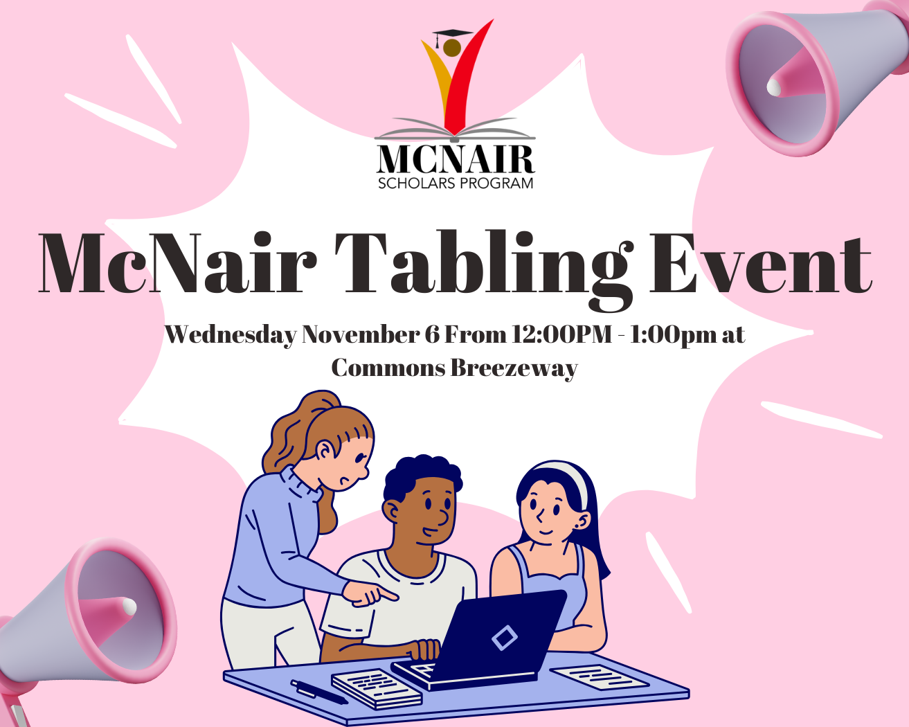 Drop by to have informal chats with members of our McNair community (student staff, scholars, and/or friends) to get to know our program better. We will also