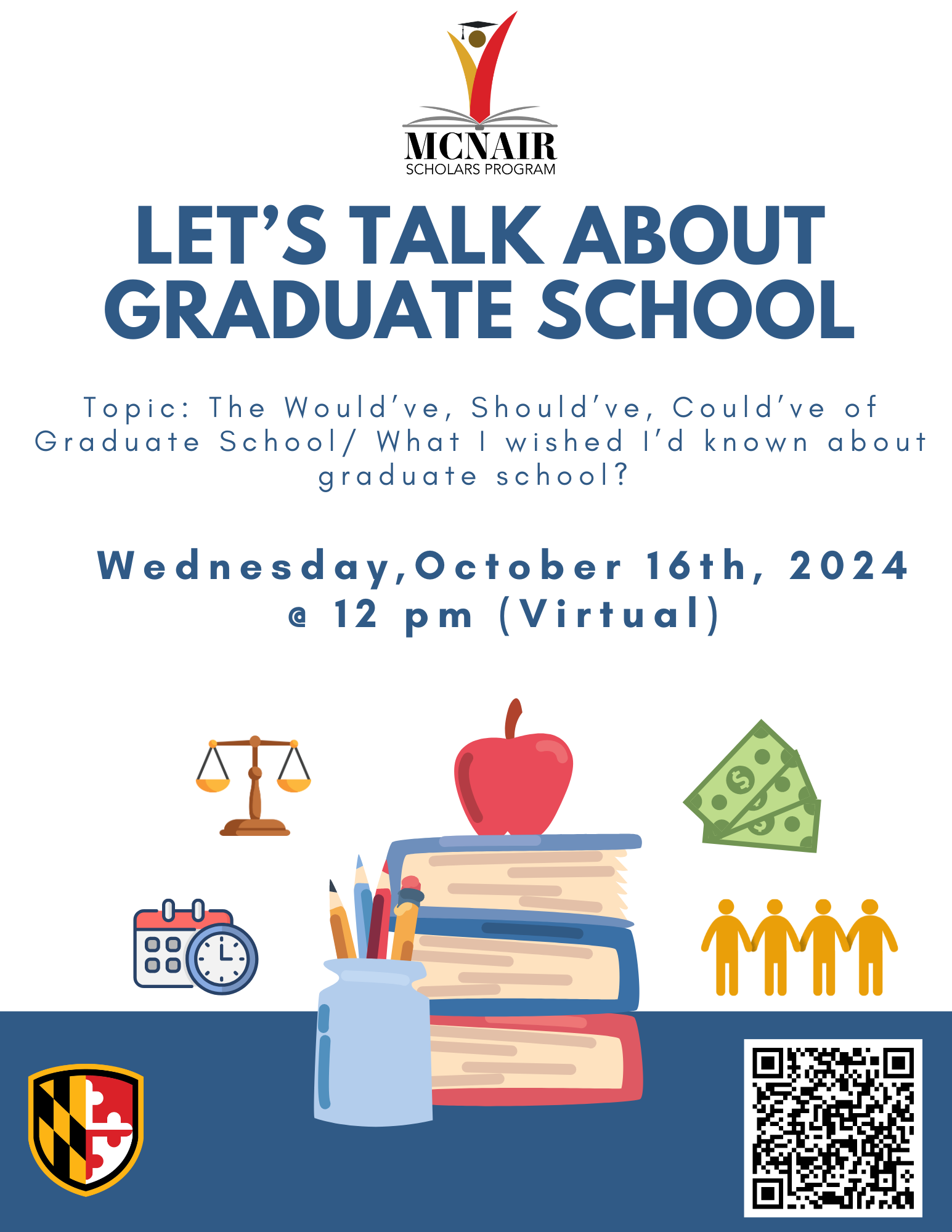 Calling all McNair network and UMBC students interested in undergraduate research from Humanities to STEM. Join us for our first Let's Talk About Graduate School session of the semester. We will have staff discuss topics that they would've, should've, could've known before attending graduate school. We'll cover topics including finance, building community, time management and more! Please come with your questions! RSVP is required on myUMBC AND google calendar if applicable.